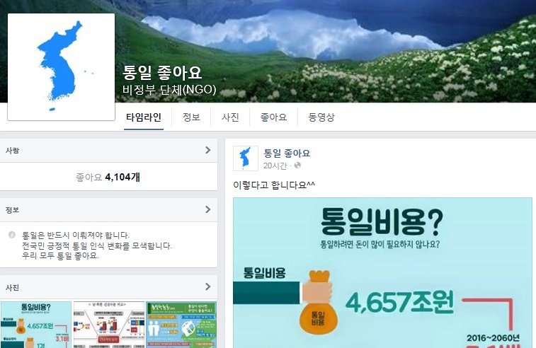 SNS»ó¿¡¼­ ±àÁ¤Àû ÅëÀÏÀÎ½Ä È®»ê°ú ÅëÀÏ °ü·Ã ¼Ò½Ä Àü´ÞÀ» À§ÇØ È°¹ßÇÑ È°µ¿À» ÁøÇà ÁßÀÎ ÆäÀ̽ººÏ ÆäÀÌÁö(https://www.facebook.com/uniko.org) ¡®ÅëÀÏ ÁÁ¾Æ¿ä¡¯°¡ ¼ø¼ö ¹Î°£ºñ¿µ¸® ´Üü·Î Á¤½Ä ¼³¸³µÇ¾ú´Ù.