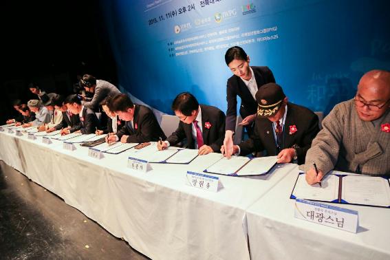 ÆòÈÆ÷·³ ÈÄ ÁøÇàµÈ ÆòÈ Çù¾à½Ä¿¡¼´Â HWPL ´ëÇ¥ ÆíÁö ¿µ»ó ½Ãû°ú ´õºÒ¾î Æ÷·³ Âü¼®ÀÚ Àü¿øÀÌ ÀüºÏ ÃÖÃÊ·Î ¡®ÆòÈÅëÀÏ ÀüÀïÁ¾½Ä ¹× ¼¼°èÆòȸ¦ À§ÇÑ ÆòȽÇõ¡¯À» ´ÙÁüÇÏ´Â Çù¾à½ÄÀ» °¡Á³´Ù.